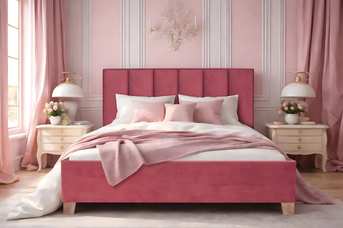 Luxusná čalúnená posteľ ERRAI s masívnou drevenou konštrukciou.