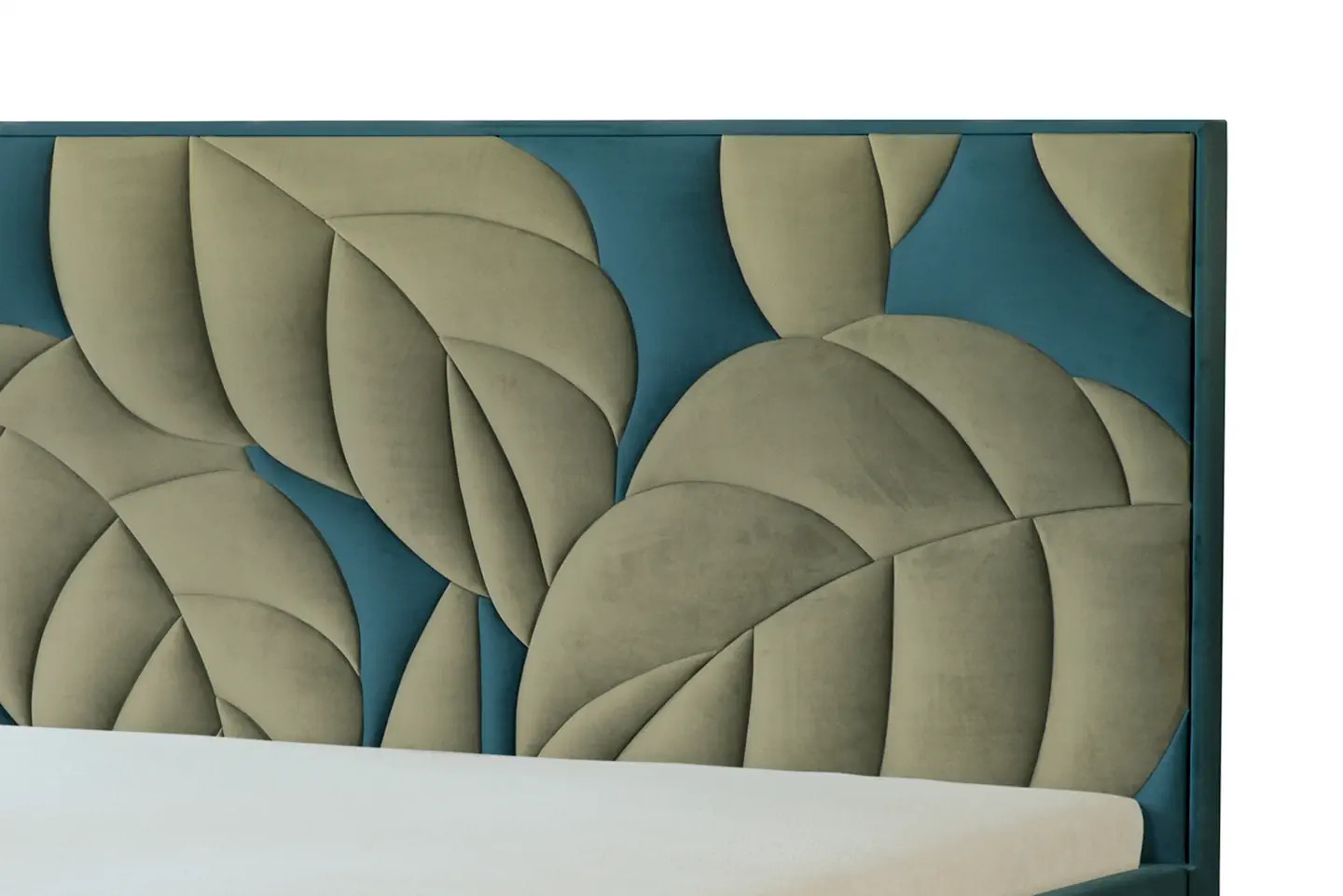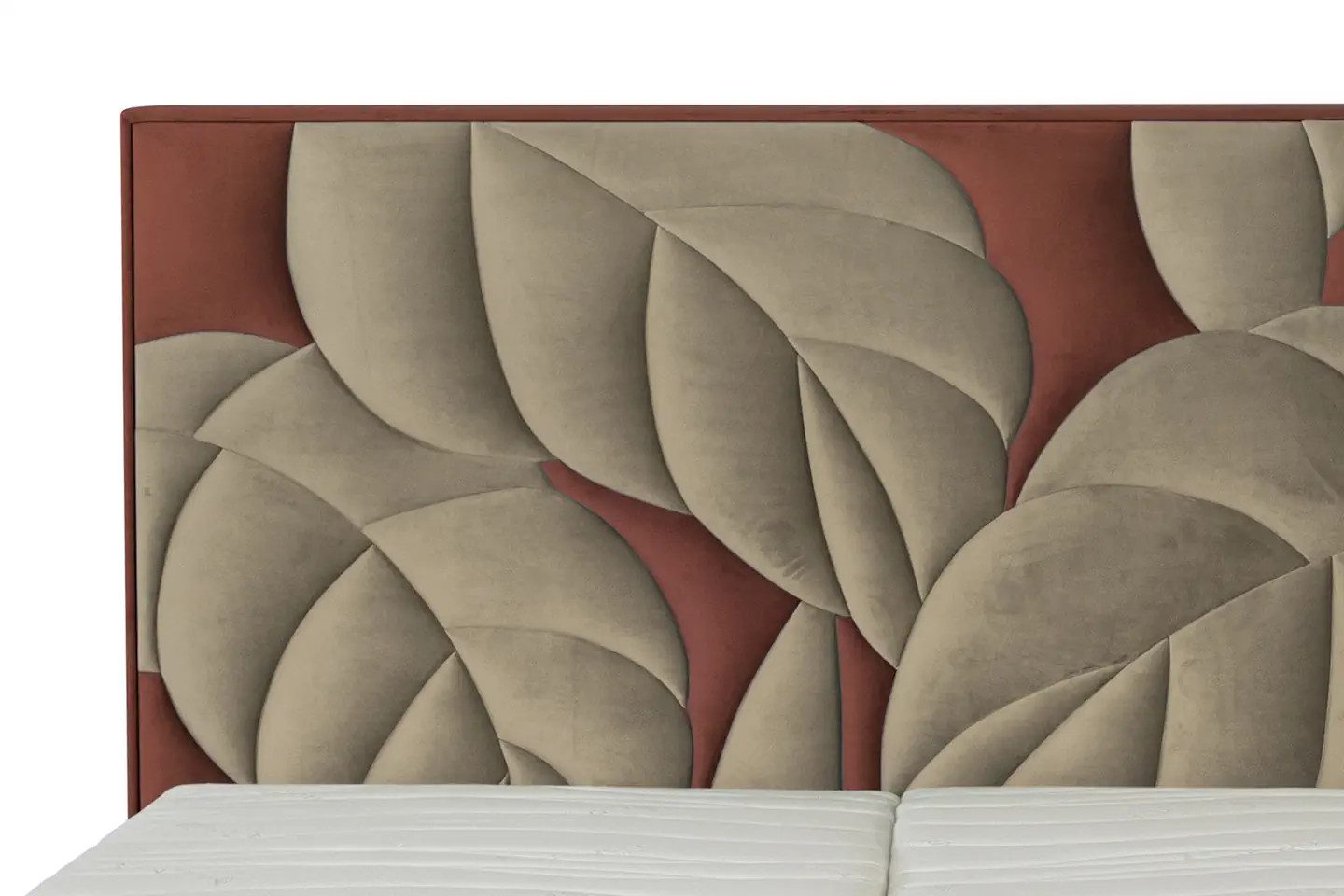 Luxusná čalúnená posteľ AUTUMN s masívnou drevenou konštrukciou.