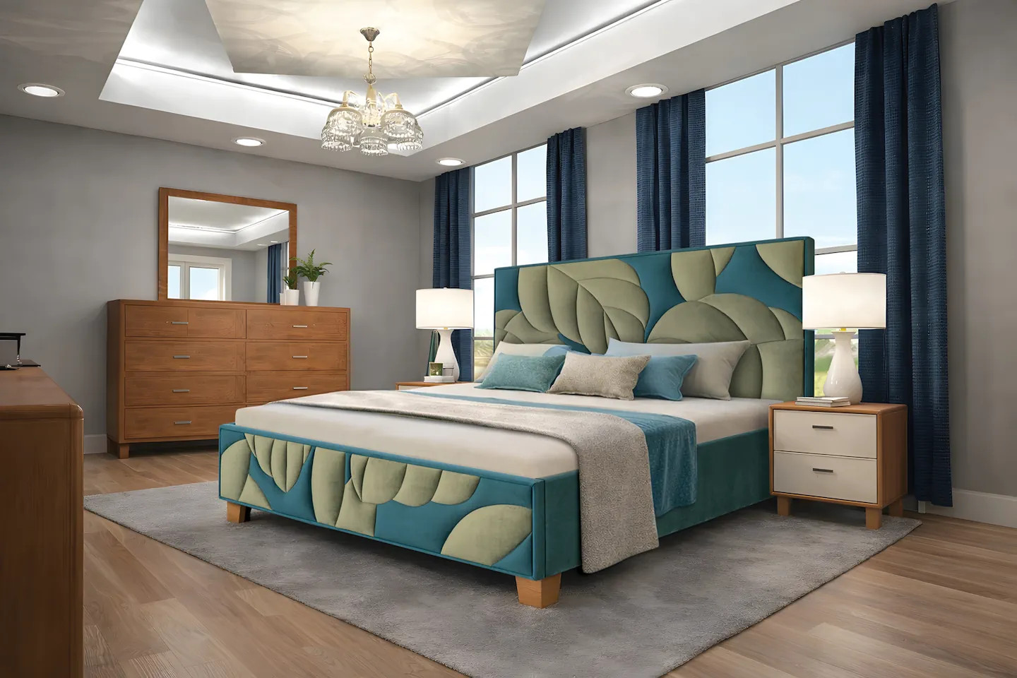 Luxusná čalúnená posteľ s masívnou drevenou konštrukciou.