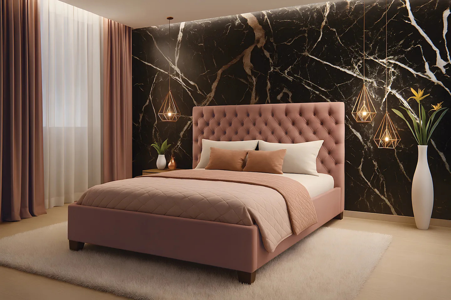Luxusná čalúnená posteľ s masívnou drevenou konštrukciou.