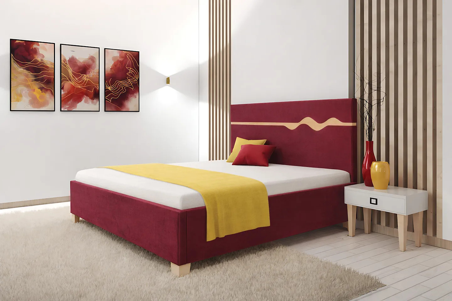 Luxusná čalúnená posteľ s masívnou drevenou konštrukciou.