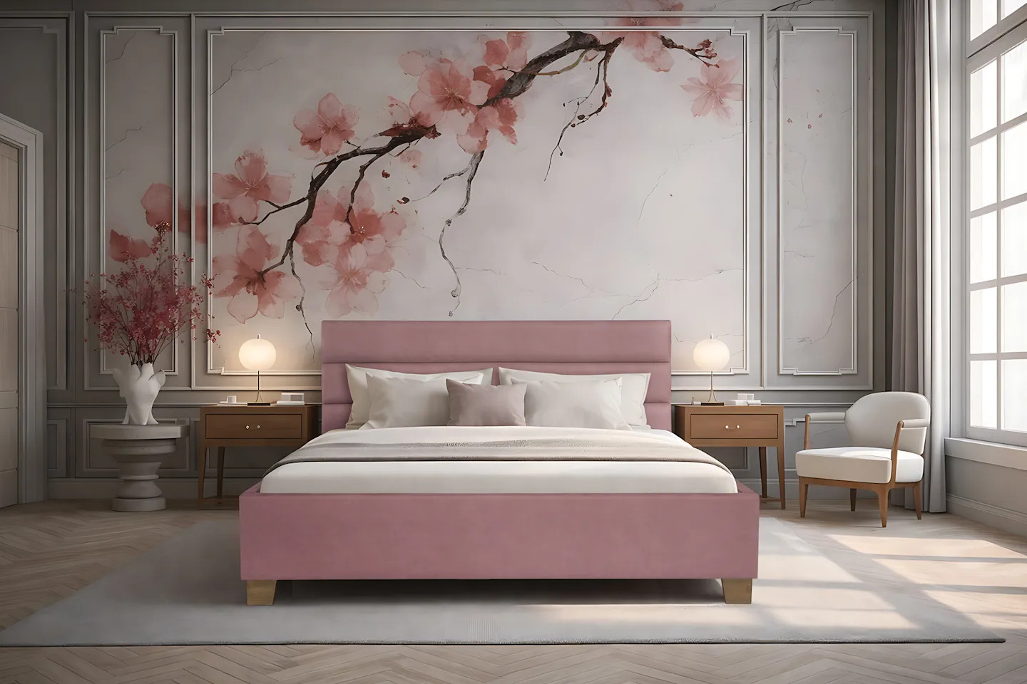 Luxusná čalúnená posteľ s masívnou drevenou konštrukciou.