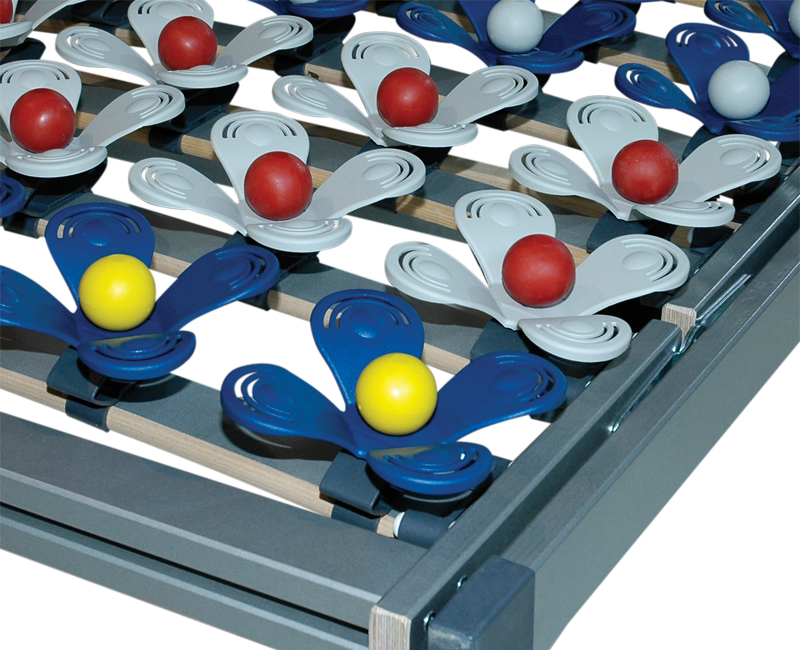 • bodové uloženie pružiacich guličiek a lupeňov v 7 zónach tvrdosti po celej ploche roštu zaisťuje dokonalé kopírovanie matraca a poskytuje telu optimálnu fyziologickú oporu pri všetkých polohách spánku