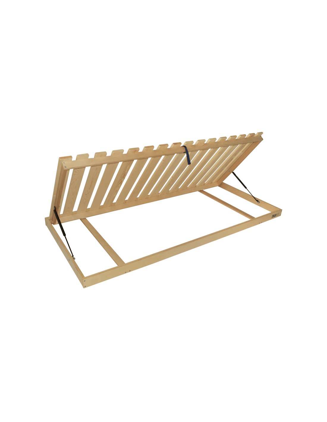 Nepolohovateľný rošt zo 16 masívnych smrekových latiek s bočným piestovým výklopom pre jednoduchý prístup do úložného priestoru postele.