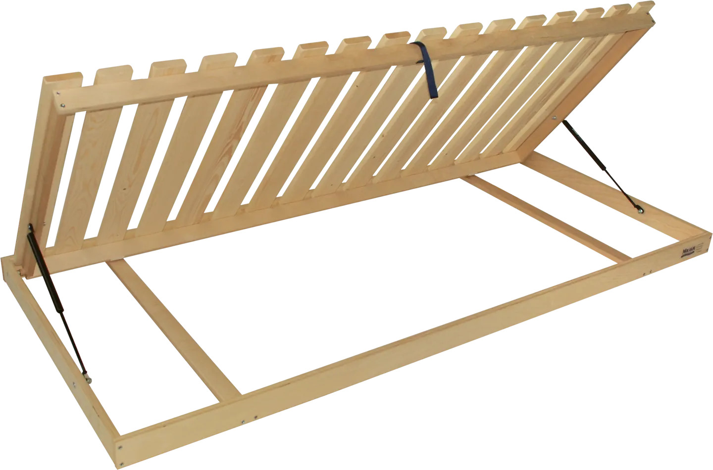 Nepolohovateľný rošt zo 14 masívnych smrekových latiek s bočným piestovým výklopom pre jednoduchý prístup do úložného priestoru postele.